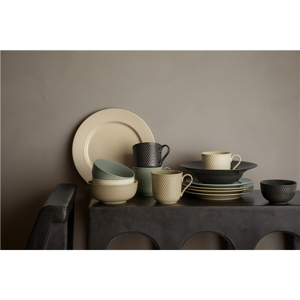 Maanläheinen ja läsnäoleva ilme pöydällä ja kädessä. Neljän elegantin maanvärin väripaletilla Rhombe Earth kutsuu meidät hidastamaan, olemaan läsnä aterialla, niiden kanssa, joiden kanssa syömme, ja huomaamaan astiaston kauneuden, josta syömme ja juomme. Sarjan 39 cl mukit ovat täydellisiä suurelle kupilliselle kahvia, teetä tai kaakaota, ja ne ovat saatavilla harmaanvihreän Mossin lisäksi myös kolmessa muussa Rhombe Earth -värissä – Marble, Clay ja Slate. Ne ovat hillittyjä maanvärejä, jotka tuovat esiin Rhombe-astiaston ikonisen kohokuvion uudella ja erilaisella tavalla ja kutsuvat meitä menemään askeleen syvemmälle ja kiinnittämään huomiota mukin juomaan ja lautasen ruokaan, aisteihin ja keskusteluun muiden kanssa pöydän ympärillä. Kaikki neljä kaunista sävyä Rhombe Earth -sarjassa ovat, kuten Lyngby Porcelænsin suosittu Rhombe Color -sarja, tarkkaan valittuja designkaksikon Stilleben toimesta, johon kuuluvat Ditte Reckweg ja Jelena Schou Nordentoft. Käytä eri Rhombe Earth -osia yhdessä kattauksessasi ja anna erikokoisten lautasten kurkistaa toistensa alta niin, että lämpimät värit saavat puhua keskenään. Rhombe Earthin lautaset, mukit ja kulhot ovat luonnollisesti myös täydellisiä sekä yhdessä että erikseen täydentämään Rhombe Color -kokoelmaasi tai yhdistettynä klassiseen valkoiseen Rhombe-astiastoon, jossa Rhombe Earth -osien harmaat ja ruskeat sävyt yhdessä Lyngby Porcelænsin linjojen kanssa luovat modernin ja rennon ilmeen ja näyttävät kauniilta valkoista posliinia vasten.