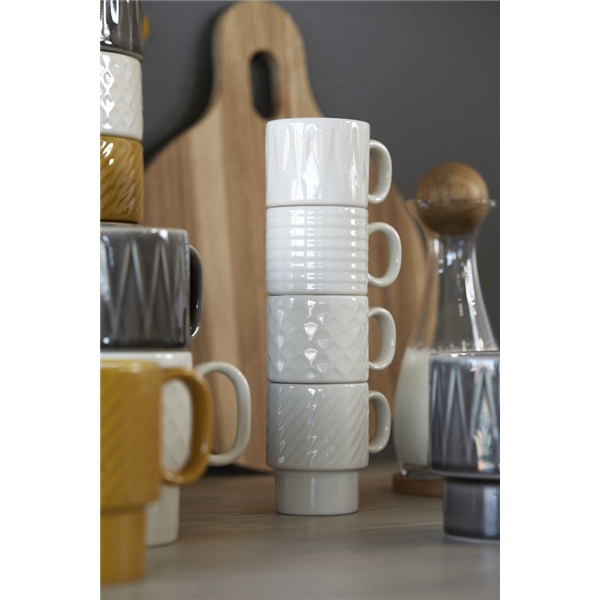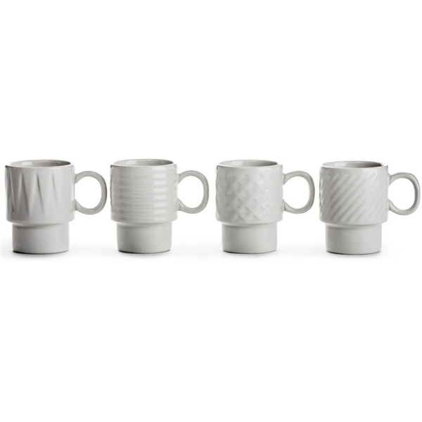 Espressomuki 4 kpl pakkauksessa tyypillisellä reliefillä. Espressomuki on suunniteltu Sagaformin ja muotoilija Margot Barolon yhteistyönä ja se on osa sarjaa Coffee & More. Sarjan muotoilu on flirtti 70-luvun suoralla, leikkisällä kielellä. Sarjaan kuuluu useita osia, kuvioita ja värejä, ollen parhaimmillaan kaikkien yhdistelmänä! Toimii espressomukina ja loistavasti myös glögimukina. Kestää mikroaaltouunin ja konepesun.