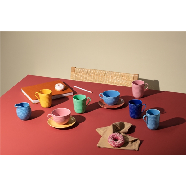 33 cl Lyngby Porcelaenin Rhombe Color muki kahvalla. Mukissa on klassinen Rhombe-kuviointi pienin timantein. Valmistettu posliinista ja siinä on ergonominen kahva, josta on mukava pitää kiinni juodessasi. Useita kauniita värejä.