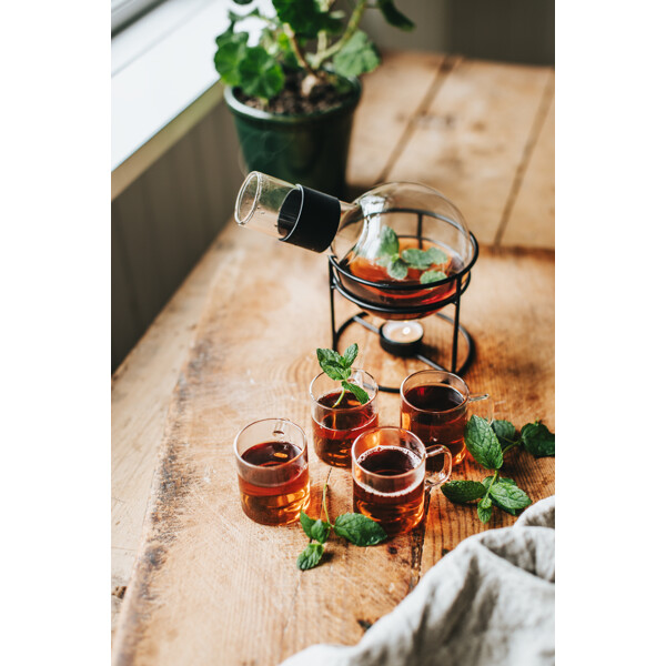 Tyylikäs pyöreä glögikannu lasista, mustalla metallijalustalla ja tilalla tuikulle. Pitää glögin lämpimänä ja valmiina tarjoiltavaksi koko illan ajan. Täydellinen adventtiin, joulupöytään ja talvi-illanviettoon. Tilavuus noin 1,3 litraa.