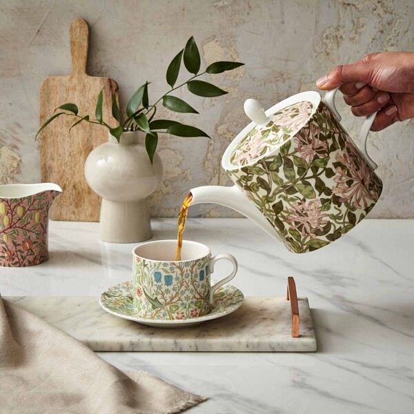 Morris & Co Honeysuckle Teekannu 110cl. Teekannu kauniilla kuviolla Morris & Co:lta. Täydellinen aamiaiselle, kahvihetkelle tai kun haluat hemmotella itseäsi hieman enemmän. Teekannu on luotu yhteistyössä Spoden ja Morris & Co:n kanssa, ja kaunis kuvio on tuloksena.Tilavuus: 110 cl.