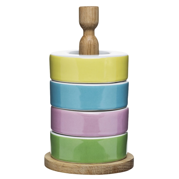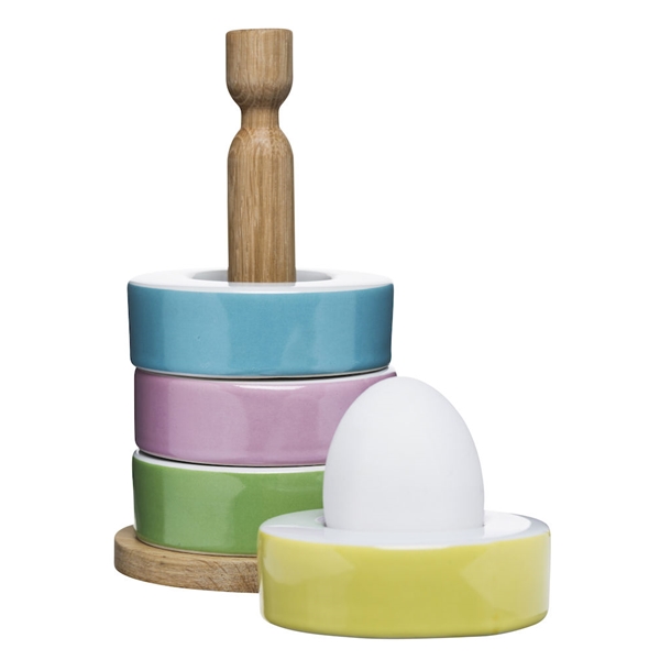 4 kpl munakuppeja ihanissa pastellisävyissä, sis. Pidikkeen. Pakattuina lahjalaatikkoon.Materiaali: Kivitavara ja bambu.Koko: Halkaisija 8 cm, korkeus 17 cm.