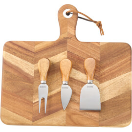 Tyylikäs tarjoilualusta akaasiapuusta, jossa on kaunis kuvio ja kolme käytännöllistä ruostumattomasta teräksestä valmistettua juustotyökalua. Täydellinen juuston ja lisukkeiden tarjoiluun illallisilla ja juhlissa. Yhdistää tyylikkään muotoilun ja toiminnallisuuden, ja on itsestään selvä yksityiskohta juustotarjottimella.