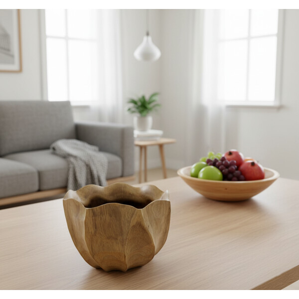 Kaunista kotiasi tällä ainutlaatuisella käsintehdyllä puukulholla, joka tuo orgaanista eleganssia ja käsityön viehätystä mihin tahansa ympäristöön. Taitavasti Thaimaassa valmistettu kulho on erottuvan tulppaanin muotoinen, ja siinä on kauniisti veistetyt, aaltoilevat reunat, jotka korostavat puun luonnollista kauneutta ja syykuvioita. Ympäristöystävällisenä esineenä se on todiste aidosta käsityöstä, täydellinen täyttämään huoneesi kestävällä taiteella ja toiminnallisella sisustuksella.