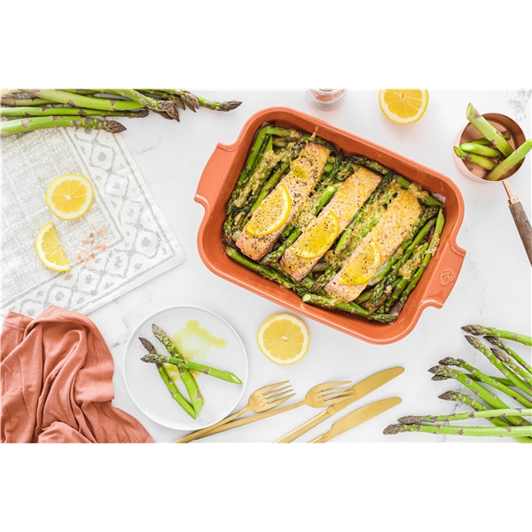 Peugeotin suorakaiteenmuotoinen, terrakottasävyinen uunivuoka. Tämä uunivuoka on täydellinen ratkaisu muuntamaan arkinen ruokapöytä juhlavaksi tarjoamalla herkullisia uuniruokia. Keramiikka on ultimaattinen materiaali raikkaille, maukkaille aterioille. Uunivuoan laadukkaan materiaalin ja sen antaman lämpöhitautensa ansiosta, pitää Peugeot Appolian keraaminen uunivuoka ruoan lämpimänä jopa 30 minuutin ajan uunistaottamisen jälkeen. Erikokoiset suorakaiteenmuotoiset uunivuoat voidaan pinota päällekkäin, joten niiden säilyttämiseen ei mene turhaa tilaa. Saatavana eri kokoja ja muotoja.