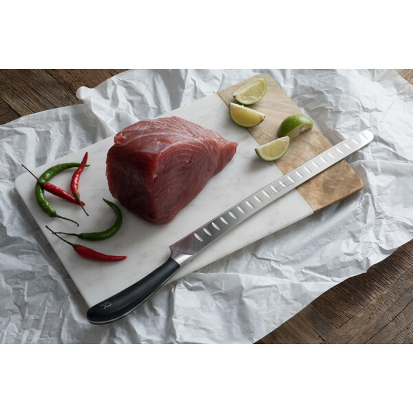 Robert Welch Signature -viipalointiveitsi, joustava 30 cm, on täysin taottu saksalaisesta DIN 1.4116 ruostumattomasta teräksestä ja siinä on täytetty ydin lisävoimaa varten. Pitkän ja ohuen teränsä ansiosta viipalointiveitsi mahdollistaa hienojen viipaleiden leikkaamisen lihasta, siipikarjasta ja kalasta. Viipalointiveitsessä on ergonominen DuPont™-kahva.