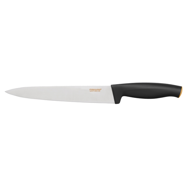 Keittiöveitsi sarjasta Functional Form. Funktional Form on Fiskarsin suosituin sarja. Suunnittelu perustuu pävittäiseen käyttöön keittiössä ja siinä keskitytään erityisesti ergonomiaan, toiminnallisuuteen ja turvallisuuteen. Hienot toiminnot kuten Softouch®-kädensija sormipysäytyksellä takaa kädensijan turvallisuuden ja mukavuuden. Terässä on mahtava reuna ja se on helppo teroittaa joko Fiskars veitsenteroittimella Roll-Sharp tai teroitusraudalla. Terä on valmistettu korkealaatuisesta, ruostumattomasta japanilaisesta teräksestä. Kovuus: HRC 53.Ergonomisesti muotoiltu kädensija liukumista estävällä Softouch®-pinnalla. Kädensija on valettu suoraan terään takaamaan kestävyyden ja hygienisuuden. Kestää konepesun.Voitti Red Dot design-palkinnon 2006. Suunnittelu: Tobias Wandrup ja Erik Thorø Lauridsen.