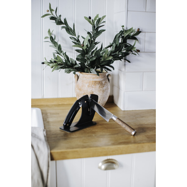Kali-veitsenteroittimella saat kätevän veitsenteroittimen, joka sekä teroittaa vaurioituneen veitsen että hienosäätää sen, ja lisäksi se pysyy tukevasti pöydällä. Kahvan ansiosta voit myös käyttää lisävoimaa teroittaessasi veitsiäsi.