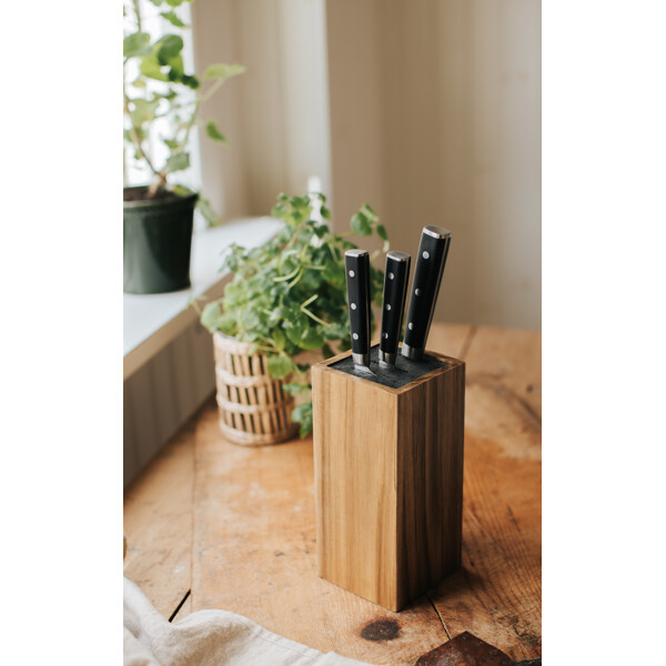 Tyylikäs ja kestävä veitsisäilytys, joka suojaa veitsien teriä. Joustavan harjasosan ansiosta lohko sopii kaikentyyppisille keittiöveitsille. Valmistettu FSC-sertifioidusta akaasiapuusta, joka tuo keittiöösi luonnollisen ja tyylikkään ilmeen.