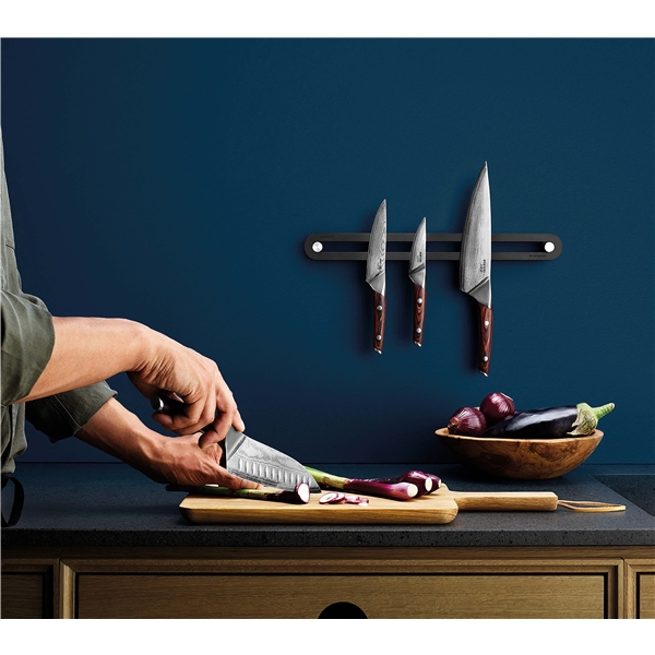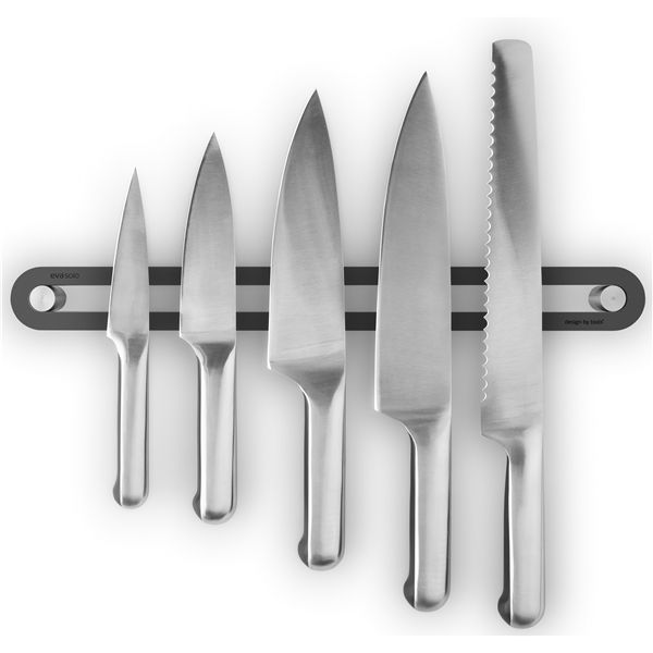 Veitsimagneetti Eva Solon Nordic Kitchen -sarjasta, ruostumatonta terästä ja kumia. Voimakkaat magneetit takaavat, että veitset pysyvät hyvin paikoillaan ja se on helppo asentaa. Veitsimagneetti puhdistetaan helposti nihkeällä rievulla. Veitsimagneetti on saanut inspiraationsa japanilaisesta perinteestä ja se sopii loistavasti saman sarjan veitsien kanssa.