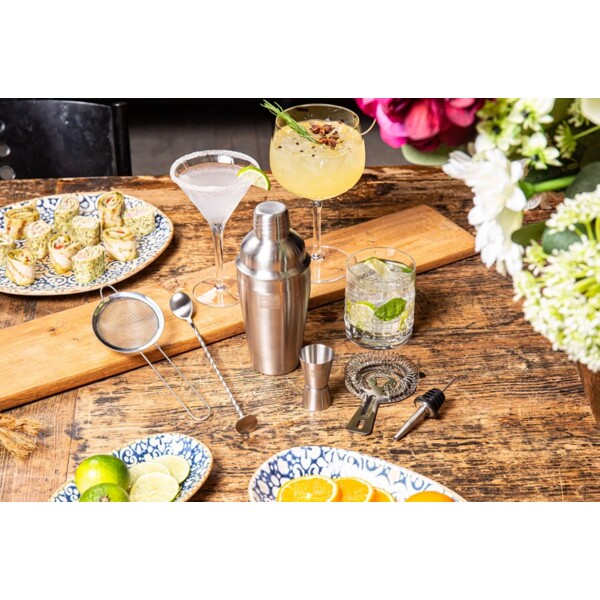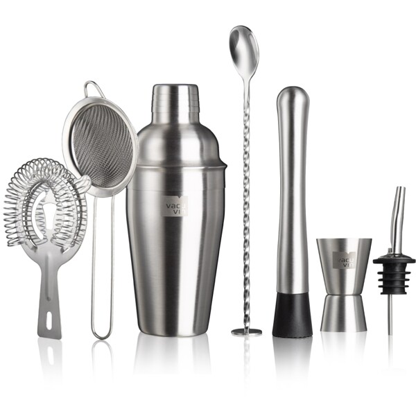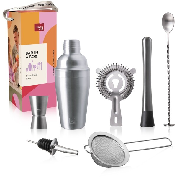 Tämä Cocktail Set sisältää 7 työkalua erilaisten cocktailien tai sekoitettujen juomien valmistamiseen. Täydellinen setti ammattimaiselle kotibaarimikolle! Cocktailshaker (550 ml) juomiesi sekoittamiseen ja ravistamiseen. Kaksoismitta (15-30 ml) 1 tai 1/2 osan alkoholipitoisten ainesosien mittaamiseen. Muddler hedelmä- ja yrttiaineiden murskaamiseen tai sekoittamiseen. Siivilä jään tai ainesosien suodattamiseen kaadettaessa shakerista. Hienosiivilä pienten jää- tai ainesosien osien suodattamiseen kirkkaan juoman saamiseksi. Kaadonokka sujuvaan alkoholin tarjoiluun pullosta. Baarilusikka varovaiseen sekoitettujen cocktailien valmistamiseen tai kerrostettujen cocktailien tekemiseen. Kaikki pakattu lahjapakkaukseen.