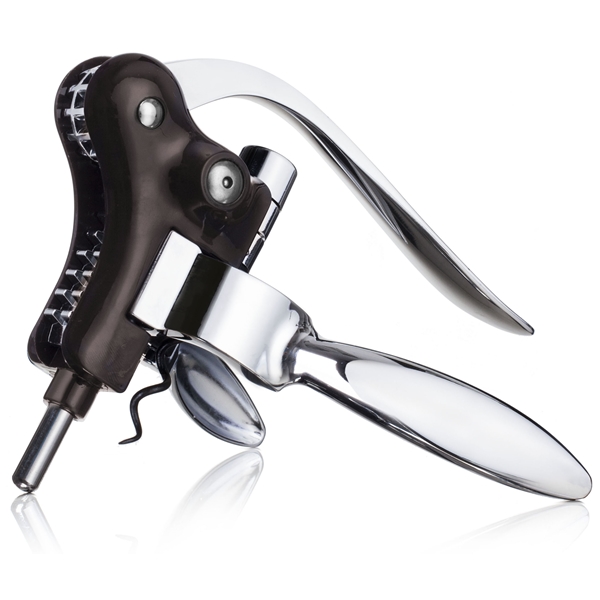 Nytt korkin avaaminen on helppoa. Poista folio, aseta korkkiruuvi pullon suulle ja paina kahvat yhteen pitääksesi sen paikoillaan. Vedä kahvaa asettaaksesi spiraalin korkkiin ja vedä ylös irrottaaksesi. Lever-action korkkiruuvi poistaa korkin yhdellä liikkeellä. Kahvasta saa pitävän otteen.