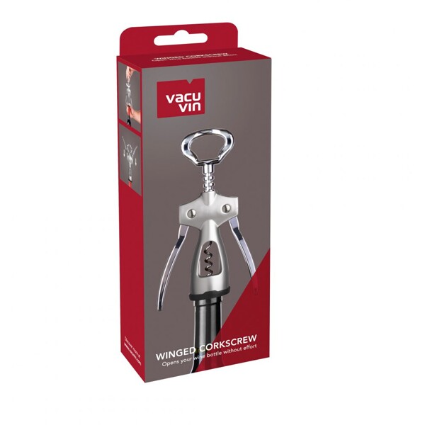Vacuvin Winged korkkiruuvi on varustettu tukevilla vipuvarsilla, jotka helpottavat viinipullon avaamista.