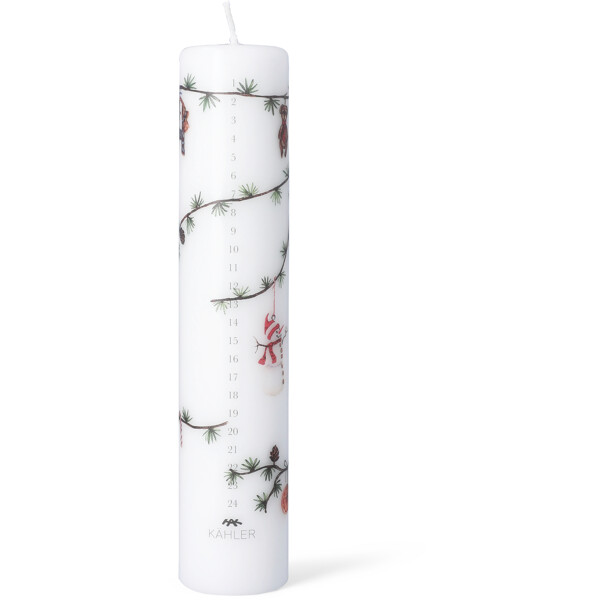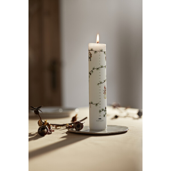 Astu joulun maagiseen ja rauhalliseen maailmaan Kählerin Hammershøi Christmas -kokoelman kanssa. Paikka, joka on täynnä rauhaa, turvallisuutta ja läsnäoloa, jossa nostalgiset ja klassiset joulumotiivit, taiteilija Rikke Jacobsenin maalaamina vesiväreillä, on siirretty Hans-Christian Bauerin suunnittelemaan Hammershøi-astiastoon. Myös Hammershøi Christmas Adventtikynttilä 2025 on perinteestä muotoutunut ja täynnä viehättäviä motiiveja, jotta voit kauneimmalla tavalla laskea päiviä jouluaattoon. Adventtikynttilän halkaisija on 5 cm ja korkeus 25 cm. Aiempiin vuosiin linjassa motiivit symboloivat kaikkea, mitä Hammershøi Christmas edustaa. Vuoden 2025 klassinen adventtikynttilä on luonnollisesti varustettu numeroilla 1–24 ja lisäksi koristeltu pienellä sinisellä silkkinauhalla varustetulla joulupukilla, suloisella punaisella kaulahuivilla varustetulla nallekarhulla, iloisella punaisella lakilla ja kaulahuivilla varustetulla lumiukolla, pienellä punaisella tonttulakilla nukkuvalla joulushiirellä, vihreässä narussa roikkuvalla appelsiiniviipaleella, hieman joulukarkeilla ja parilla punotulla joulusydämellä. Kaikki nämä motiivit on kauniisti aseteltu tutulle setripuun oksalle lehtikuusenkäpyjen kanssa. Adventtikynttilä on valmistettu täysin jalostetusta erikoisvahasta, joka palaa tasaisesti ja kauniisti aina 24. joulukuuta asti.