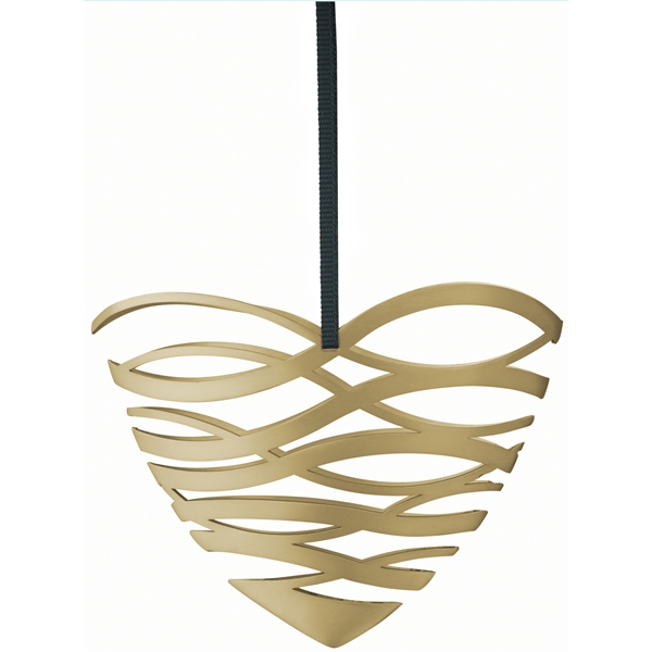 Joulukoristeen messinkisydän kahdella nauhalla, tummanvihreällä ja lämpimän punaisella.
