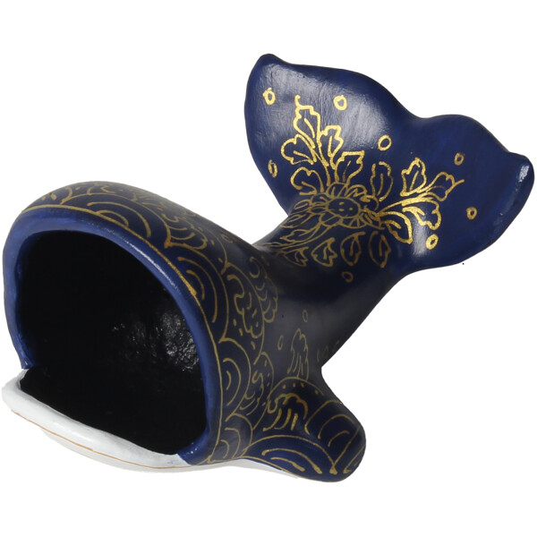 Tutustu ainutlaatuiseen koristeeseen viehättävän käsintehdyn valaan avulla. Huolellisesti Thaimaassa valmistettu, kierrätetystä paperimassasta tehty valas on koristeltu käsinmaalatuilla thaimaalaisilla kuvioilla, jotka ovat saaneet innoituksensa kauniista perinteisestä taiteesta. Se toimii kiehtovana koriste-esineenä, ja sen avoin suu tarjoaa myös ainutlaatuisen paikan korujen tai muiden pienten aarteiden säilytykseen.