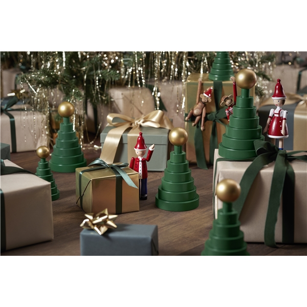 Joulun taikaa tulkittuna puusta, perustuen arkistojen alkuperäissuunnitteluun. Kay Bojesen luo omaperäisiä tarinoita puusta ympäri vuoden, ja Kay Bojesenin universumin joulukuusen myötä saat ikonisen ja tyylikkään joulukoristeen tutussa muodossa, joka perustuu klassiseen pinotorniin. Kuusen vihreä väri on otettu tornin vihreästä renkaasta ja latvan pallo on maalattu kullalla niin, että se kimaltelee kuin tähti. Arkistokuvista voi nähdä, että Kay Bojesen rakasti tehdä pieniä joulukohtauksia, ja siinä yhteydessä hän käytti itse pinotornia joulukuusena luodakseen tarinoitaan. Kay Bojesen -joulukuusi on saatavilla sekä tässä pienemmässä 13,5 cm koossa että hieman suuremmassa 19,5 cm versiossa, jotta voit valita juuri sen joulukuusen, joka sopii parhaiten koristeluihisi – tai yhdistää kaksi tai useampia ja luoda tunnelmallisen ja minimalistisen asetelman. Joulukuusien renkaat on valmistettu FSC®-sertifioidusta kumipuusta, kun taas liimattu latva on valmistettu FSC®-sertifioidusta pyökistä. Kuten aina, manuaalinen tuotanto värin ja painatuksen osalta on suoritettu suurella tarkkuudella ja huolellisuudella, joka on ominaista kaikille Kay Bojesenin puufiguureille. Puu, väri ja käsityö ovat keskiössä ja antavat figuureille aivan erityisen laadun – sekä fyysisesti että esteettisesti. Kay Bojesen työskenteli filosofian pohjalta, jonka mukaan puu saa elämän vasta, kun sillä on tarina. Tämä oli läpikäyvää kaikissa hänen figuureissaan ja tulee myös selvästi esille kahden joulukuusen kohdalla, joiden pyöreät muodot ja klassiset linjat herättävät joulutarinan eloon. Kauneimmalla mahdollisella tavalla Kay Bojesenin leikkisät ja mielikuvitukselliset ajatukset elävät edelleen joulukuusessa, jossa punaiset ja kultaiset pallot on kiinnitetty renkaiden ulkopuolelle. Kay Bojesen vaati herättämään mielikuvituksen ja lapsen meissä kaikissa – myös joulukuussa, jolloin välitön ilo, odotus ja taika ympäröivät meitä 24 lumouttavaa päivää – tai hieman enemmän.