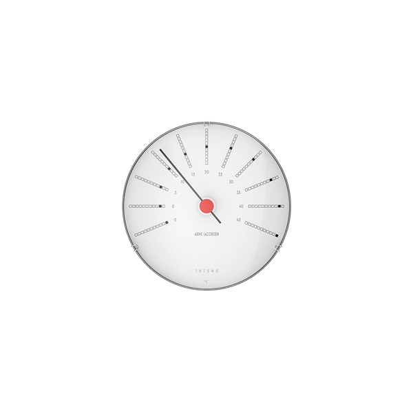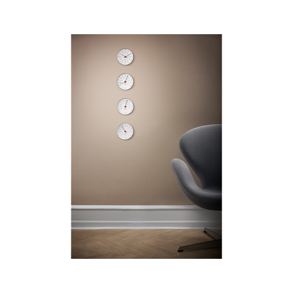 Muotoilu: Arne JacobsenSeinäkello (aika), barometri (ilmanpaine), hygrometri (ilmankosteus) ja lämpömittari (lämpötila).Arne Jacobsen sääasema ei anna vain yleiskuvaa ilmankosteudesta, lämpötilasta, ilmanpaineesta ja ajasta - se on myös kaunista ja pelkistettyä tanskalaista muotoilua seinälle ripustettavaksi. Tanskalainen, kansainvälisesti tunnettu arkkitehti Arne Jacobsen on antanut oman vivahteensa kaikelle arkkitehtuurille sisustuksessa, huonekalusuunnittelussa ja grafiikassa. Arne Jacobsenin suunnittelemia rakennuksia on Kansallispankki (1971), johon hän suunnitteli Bankers seinäkellon. Inspiraatio tähän uuteen sääasemaan tulee tästä kellosta. Sääasema koostuu seinäkellosta (aika), barometrista (ilmanapaine), hygrometrista (ilmankosteus) ja lämpömittarista (lämpötila) ja se on kooltaan Ø 12 cm.