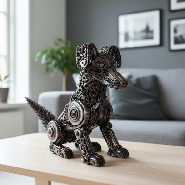 Anna huoneellesi viehätystä käsintehdyllä Gear Pup -veistoksellamme, jonka taitavat käsityöläiset ovat luoneet kierrätetystä metallista. Jokainen osa kertoo muodonmuutoksen tarinan leikkisillä yksityiskohdilla, kuten uteliailla silmillä ja heiluvalla hännällä. Tämä ainutlaatuinen metallikoiraveistos yhdistää rustiikkisen teollisen tyylin kierrätetyistä materiaaleista peräisin oleviin osiin, tehden siitä viehättävän keskustelun aloittajan ja kestävän taiteen symbolin. Täydellinen koko tuomaan luonnetta mihin tahansa kotiin, se ilmentää iloa ja luovuutta.
