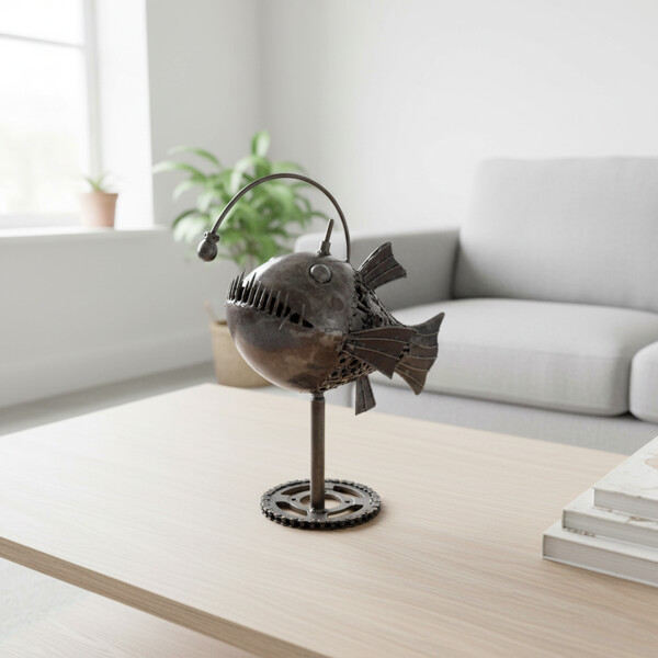 Taitavat käsityöläisemme ovat muuttaneet kierrätysmateriaalit syvänmeren Angler Fish -kalan vangitsevaksi ja mielikuvitukselliseksi esitykseksi, täydellisenä sen ikonisella hohtavalla syötillä. Jokainen piikki, jokainen hammas ja sen erottuva valo on muotoiltu, luoden todella ainutlaatuisen veistoksen, joka yhdistää teollisen muotoilun mystiseen vedenalaiseen viehätykseen. Tukevasti, hammasrattaista inspiroitu jalusta takaa vakauden ja lisää sen ainutlaatuista luonnetta.