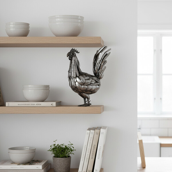 Tuo kotiisi rustiikkista viehätystä teollisella vivahteella tämän upean 100% käsintehdyn metallisen kanaveistoksen avulla! Tämä ei ole pelkästään hauska koriste; se on aito taideteos, joka on huolellisesti luotu kierrätetystä metallista, mikä tekee siitä kestävän ja vastustamattoman viehättävän lisän mihin tahansa tilaan.