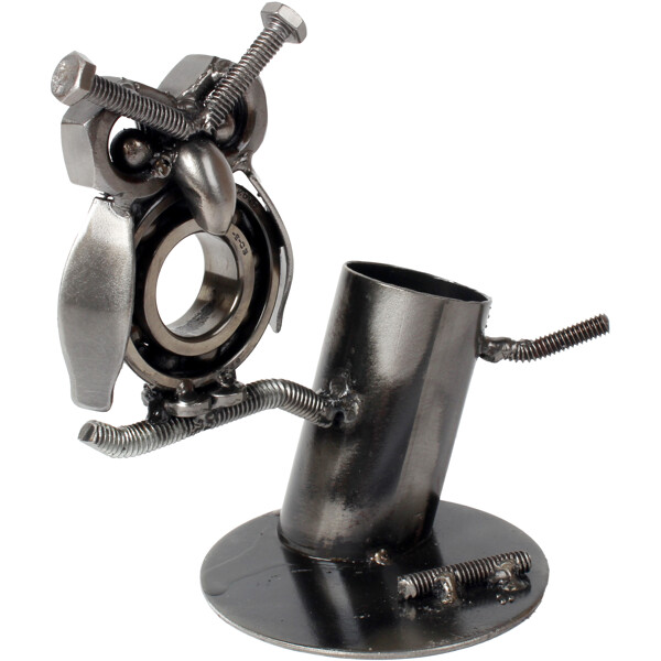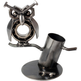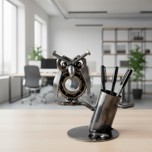 Uudista toimistosi tai kotisi viehättävällä käsintehdyllä pöllöveistoksellamme, joka on valmistettu kierrätetystä metallista taitavien käsityöläisten toimesta. Tämä ainutlaatuinen teos sisältää yksityiskohtia, kuten muttereista tehdyt silmät, ja toimii kynätelineenä, joka auttaa pitämään toimistosi järjestyksessä. Sen yhdistelmä rustiikkista viehätystä ja modernia kestävyyttä tekee siitä toiminnallisen taideteoksen.