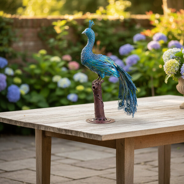 Uudista kotisi käsintehdyllä riikinkukkometalliveistoksellamme, joka on upea 100 % käsintehty teos kierrätetystä metallista. Tyylikäs veistos, jossa on kerroksia ja eloisia sinisiä ja vihreitä sävyjä, tuo eksoottista viehätystä ja taiteellista tyyliä mihin tahansa sisustukseen.