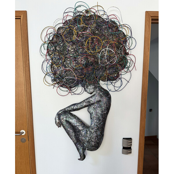 Luo voimakas taiteellinen ilme kotiisi tällä upealla käsintehdyllä metalliseinätaiteella. Huolellisesti metallista veistetty, tämä ainutlaatuinen seinätaide esittää abstraktia naisfiguuria, jolla on dynaaminen, tilava muoto, joka on luotu toisiinsa kietoutuneilla metallilenkeillä, luoden vangitsevan visuaalisen tekstuurin. 100% käsintehty, se on aitoa käsityötaitoa ja luovuutta, täydellinen lisäämään vaikuttavan keskipisteen mihin tahansa suureen seinään.