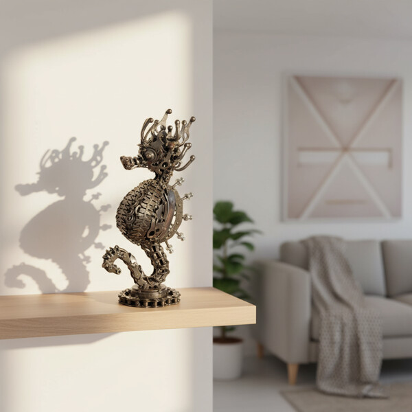 Perinteisen thaimaalaisen kanok-taiteen monimutkaisten ja virtaavien kuvioiden inspiroima tämä merihevosveistos ilmentää armoa ja voimaa. Taitavat käsityöläisemme ovat muuttaneet kierrätysmateriaalit kiehtovaksi esitykseksi, jossa jokainen hammasratas, ruuvi ja metallikomponentti on harkitusti integroitu luomaan liikkeen ja yksityiskohtaisen eleganssin tunnetta, joka muistuttaa klassisia thaimaalaisia ​​aiheita.