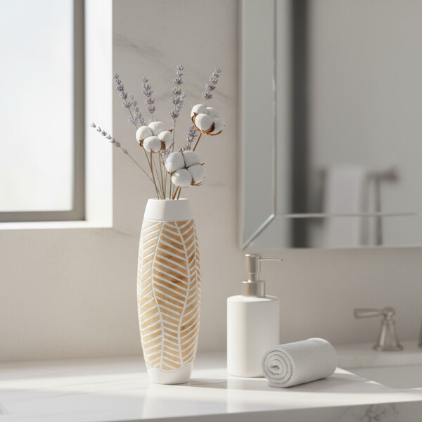 Tuo kotiisi luonnollista eleganssia ja käsityön viehätystä tällä upealla korkealla käsintehdyllä koristeellisella puuvaasilla. Huolellisesti Thaimaassa valmistettu vaasi on varustettu ainutlaatuisella valkoisella lehtikuviolla luonnollisessa puussa, jota täydentävät valkoiset yksityiskohdat ylä- ja alaosassa. Tämä ympäristöystävällinen teos on todiste aidosta käsityöstä, täydellinen lisäämään tilaasi kestävällä taiteella ja vaikuttavalla visuaalisella vetovoimalla. Saatavilla eri muodoissa.