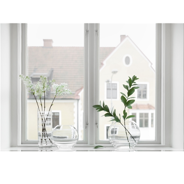 Muotoilu: Magnus ForthmeiierTiukka ja minimalistinen kokonaisuus. Muoto pehmentyy vapaasti kulkeviin raitoihin, jotka kiertävä maljakkoa, etsatut maljakon pintaan. Täytä kukilla tai anna olla sellaisenaan. Maljakko on hieno itsekseen tai pienessä ryhmässä.Koko
