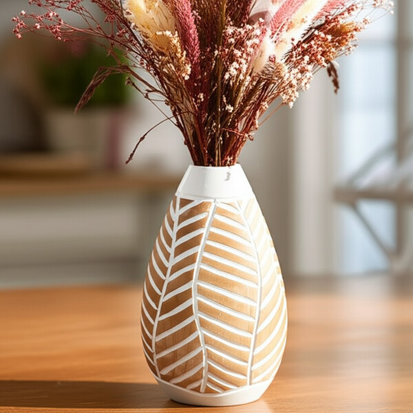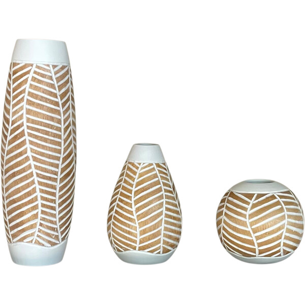 Lisää sisustukseesi ripaus orgaanista kauneutta ja käsityön viehätystä tällä käsintehdyllä pisaranmuotoisella puuvaasilla. Huolellisesti Thaimaassa valmistettu vaasi on varustettu ainutlaatuisella valkoisella lehtimäisellä kuviolla luonnollisessa puussa, jota täydentävät valkoiset yksityiskohdat ylä- ja alareunassa. Tämä ympäristöystävällinen esine on aitoa käsityötä, joka tuo kestävää taidetta ja kutsuvan muodon kotiisi. Saatavilla eri muodoissa.