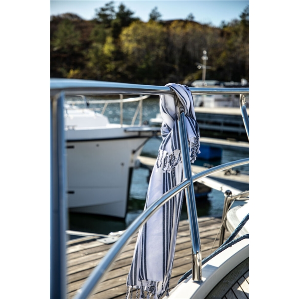 Lord Nelsonin Hamam Torsvik valkoisella pohjalla ja tummansinisin raidoin tai tummansinisellä pohjalla ja valkoisin raidoin. Klassinen, tyylikäs ja kesäinen. Hamamin hyvinä puolina on, että se kuivuu nopeasti, vie vähän tilaa ja sitä voi käyttää pyyhkeenä, pöytäliinana, vaatteena ym. Vain mielikuvitus asettaa rajat.