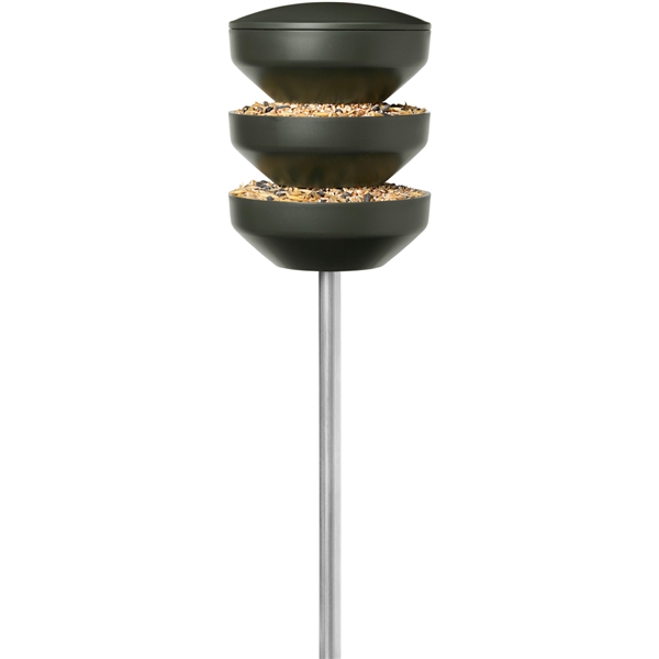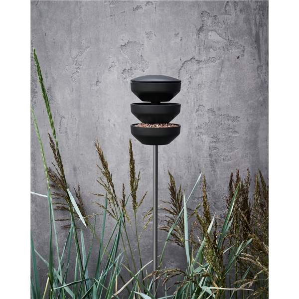 Birds Lintujen ruokinta-astia tolppamuodossa tarjoaa tyylipuhtaan syöttöastian eri tasoin ja se on helppo täyttää ylhäältä, mista siemenet valuvat alas eri kulhoihin. Se on muotoiltu luonnollisin värisävyin ja se istuu siten hyvin ulkoympäristöön. Pohjassa on sisäänrakennettu aukko, josta sadevesi voi valua pois ja se pitää astian pakkasta kestävänä. Rosendahl REDUCE ovat tuotteita, joiden ajatuksena on luoda vastuuntuntoisesti tuotettua muotoilua kaikille saatavaksi.