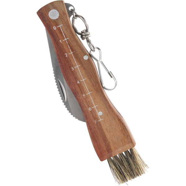Käytännöllinen sieniveitsi, jossa on taittuva terä, puhdistusharja ja mitta-asteikko puukahvassa. Täydellinen sienestykseen metsässä. Kätevä karabiinihaka, jonka avulla voit helposti kiinnittää sen vyöhön tai reppuun. Välttämätön kaikille sienien ystäville.