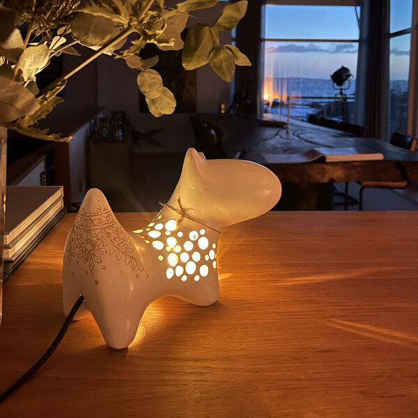 Ge kodittiin ainutlaatuista viehätysvoimaa käsintehdyllä Bull Terrier -koiralampullamme. Taitavasti Thaimaassa valmistettu kierrätetystä paperista, tätä viehättävää lamppua koristavat monimutkaiset, käsinmaalatut thaimaalaiset kuviot, jotka ovat saaneet inspiraationsa perinteisestä Benjarong-taiteesta, tuoden sekä valaistusta että luonnetta mihin tahansa huoneeseen. Saatavana useissa väreissä. Koko: Noin 10 x 22 x 16 cm. Materiaali: Kierrätetystä paperista valmistettu papier-maché, kestävää sisustusta varten. Käsinmaalattu yksityiskohtaisilla thaimaalaisilla kuvioilla, mikä tekee jokaisesta kappaleesta ainutlaatuisen taideteoksen. Suloinen Bull Terrier -muoto tuo leikkisän mutta silti hienostuneen elementin, täydellinen olohuoneeseen, makuuhuoneeseen tai lastenhuoneeseen. Helppo puhdistaa kostealla liinalla.