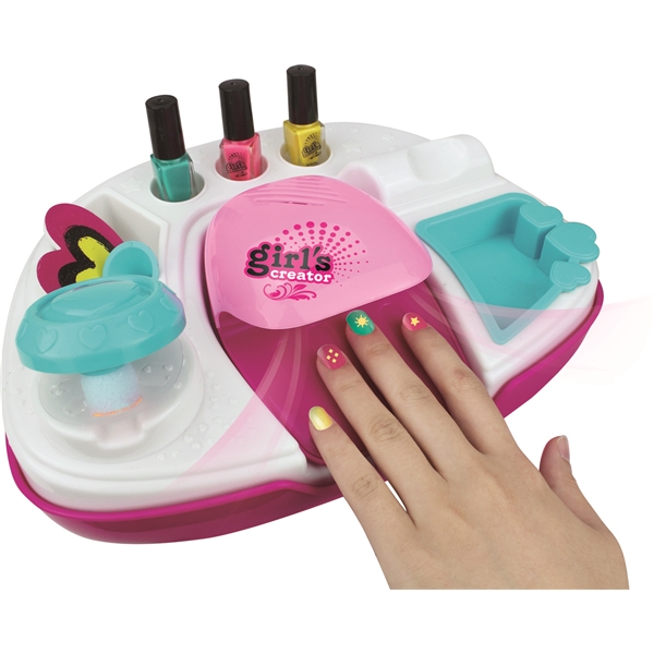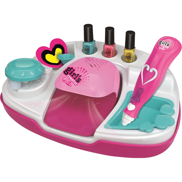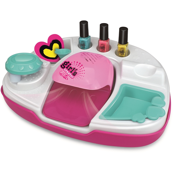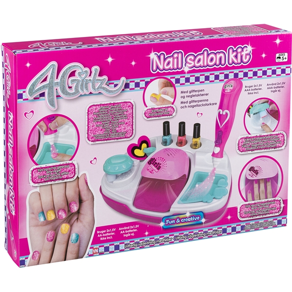 4-Girlz Mega Kynsisalonki on iso kynsisalonki ja sisältää paristokäyttöisen kimallekynän ja kynnenkuivattajan, työtason, 3 kynislakkaa, 4 kynsimallia, kuviomallia, 2 pussillista kimalletta, kynsiviilan, sieniä ja paljon muuta.