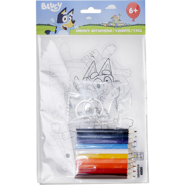 Setti sisältää neljä arkkia kutistemuovia, joissa on seitsemän kuviota, kymmenen kynää, kaksi avaimenperää ja yhdeksän ketjua. Kaikki mitä tarvitaan luovaan ja hauskaan askarteluun kaikille pienille Bluey-faneille!