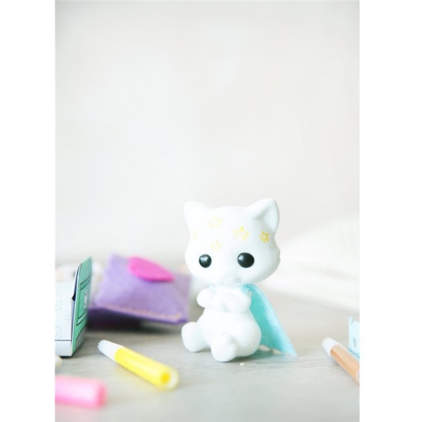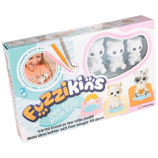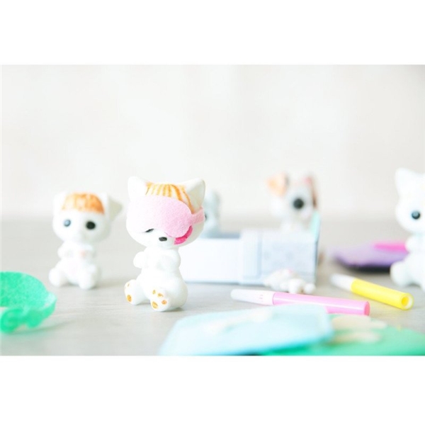 Pienten kissojen on aika mennä nukkumaan. Väritä kissojen pehmeät turkit paketin vesiliukoisten tussien avulla. Kun haluat vaihtaa kissat eri värisiksi, huuhtelen vain ne juoksevan veden alla, annat kuivua ja värität uudelleen. Kissoilla on myös makuupussit, jotka tulee koristella. Innostava yhdistelmä leikkiä ja askartelua! Pakkaus sisältää 3 kissaa, kolme vesiliukoista tussia ja peittomateriaalin.