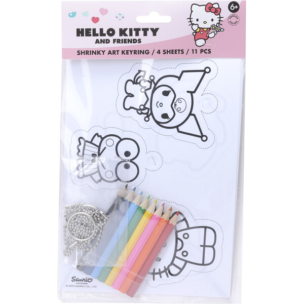 Setti sisältää neljä arkkia kutistemuovia, joissa on 11 kuviota, kahdeksan kynää, kaksi avaimenperää ja yhdeksän ketjua. Kaikki, mitä tarvitaan luovaan ja hauskaan askarteluun kaikille pienille Hello Kitty -faneille!