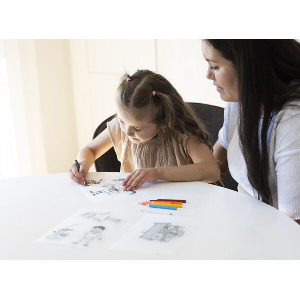 Väritä, leikkaa ja katso, kuinka hahmot kutistuvat uunissa, jolloin niistä tulee kovia ja kestäviä, täydellisiä avaimenperiksi tai koristeiksi lasten laukkuun.