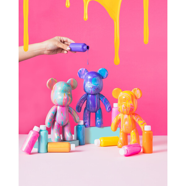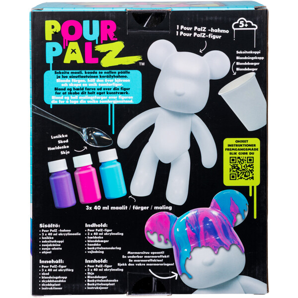 Pour Palz -karhu on väritön. Sekoita värit haluamallasi tavalla, kaada ne hahmon päälle ja anna kuivua. Saat täysin ainutlaatuisen keräilyhahmon, joka ei muistuta mitään muuta!