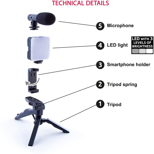 Sisältö: - LED-rengasvalo 20 cm USB-sähkökaapelilla ja 12 eri valaistusasetusta - smartphone-pidike - vihreä näyttö 1,8 x 1,5 m - jalusta, joka voidaan säätää 80 cm korkeuteen asti.