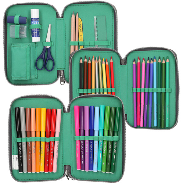 Kolme erillistä lokeroa ovat täysin täytetty kaikella, mitä tarvitaan piirtämiseen, kirjoittamiseen ja askarteluun: 18 värikynää ja huopakynää, 2 lyijykynää, teroitin, pyyhekumi, viivoitin, sakset, liimapuikko sekä pieni tarratasku.