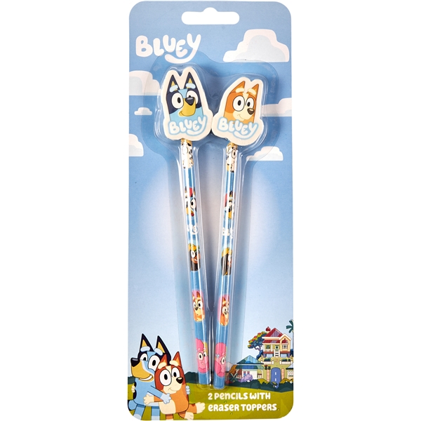 Hauska kynäsetti Bluey-teemalla. Kynäsettiin kuuluu kaksi kynää, joiden yläosassa on pyyhekumi. Pyyhekumit esittävät Blueyta ja hänen siskoaan Bingoa. Mainio kaikille Bluey-faneille.