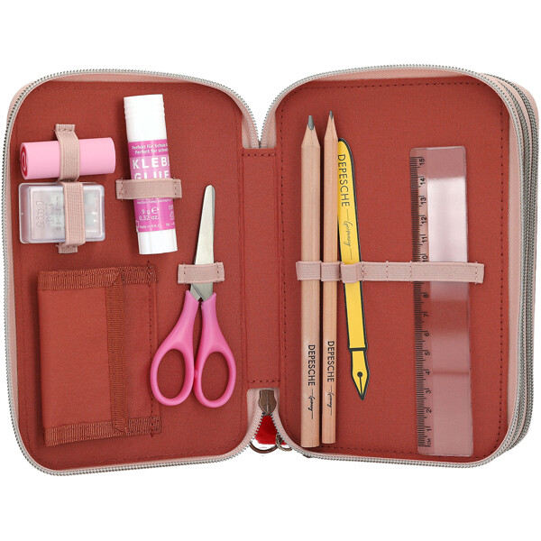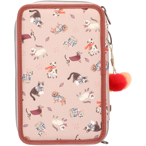 Suloinen ja käytännöllinen penaali TOPModel-sarjasta FUR EVER FRIENDS puuterin- ja kuparinvärisenä, jossa on söpö koirien ja kissojen allover-kuvio sekä suuri kuva TOPModel Candysta, joka pitää kahta koiraa ja kissaa etupuolella. Kolme erillistä lokeroa ovat täysin täytetty kaikella, mitä tarvitaan piirtämiseen, kirjoittamiseen ja askarteluun: 18 värikynää ja huopakynää, 2 lyijykynää, teroitin, pyyhekumi, viivoitin, sakset, liimapuikko sekä pieni tarratasku.