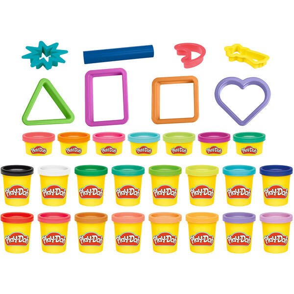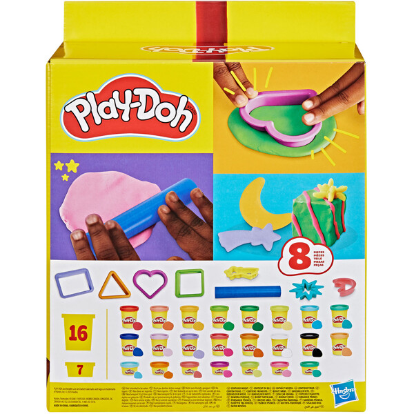 Setti on suunniteltu herättämään lasten luovuus 23 purkilla eläväistä muovailuvahaa ja 8 tärkeällä Play-Doh-työkalulla. Setti sisältää 7 hauskan muotoista leikkuria, kuten kolmio, suorakulmio, neliö, sydän, kuu, komeetta ja tähdenlento, jotta lapset voivat tutkia erilaisia muotoja ja kuvioita. Mukana on myös rulla, jolla voi tasoittaa massaa ja helpottaa leikkureiden käyttöä.