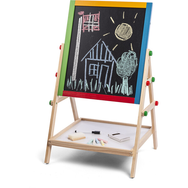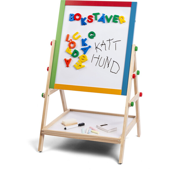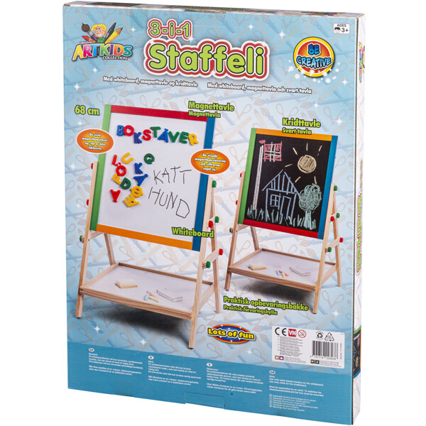 Älykäs 3-in-1-maalausteline, jota voidaan käyttää liitutauluna, valkotauluna ja magneettitauluna. Käytännöllisellä säilytyshyllyllä taulun alla.