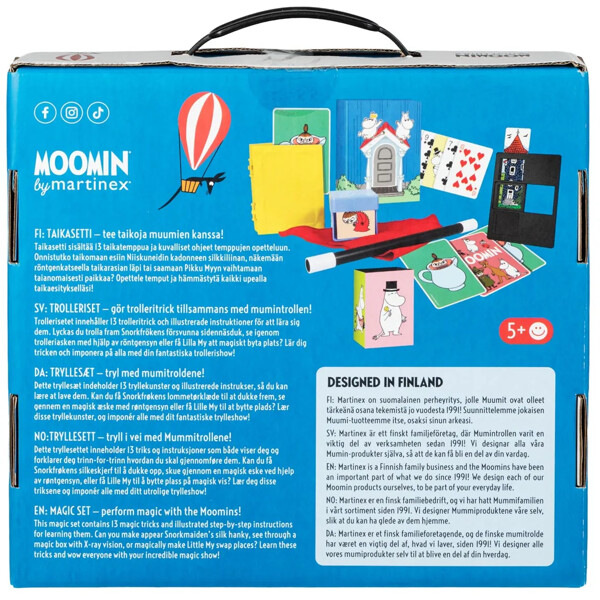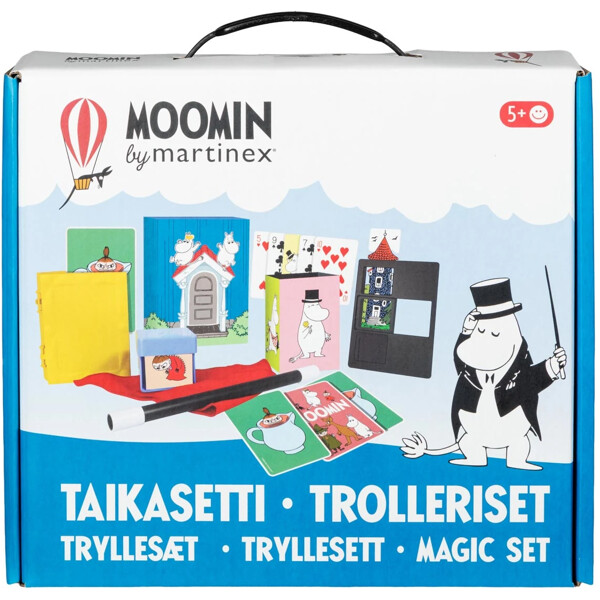 Sisältö: taikaputki, silkkinenäliina, taikakehys, kortit, korttilaatikko, röntgenlaatikko, noppa, yllätyslaatikko, taikasauva, ohjeet suomeksi, ruotsiksi, tanskaksi, norjaksi ja englanniksi.
