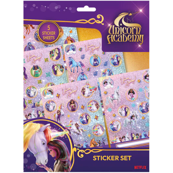 Unicorn Academy -tarra-arkki, jossa on 5 x 20 tarraa = yhteensä 100 tarraa.